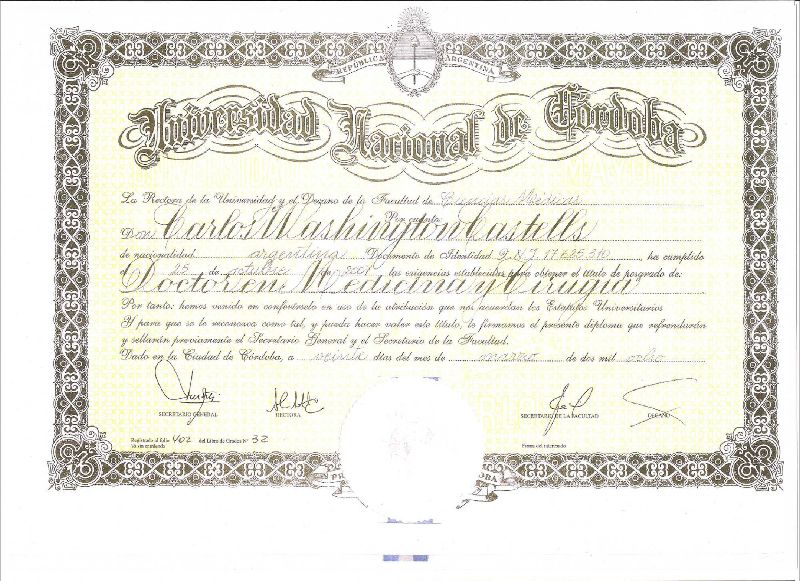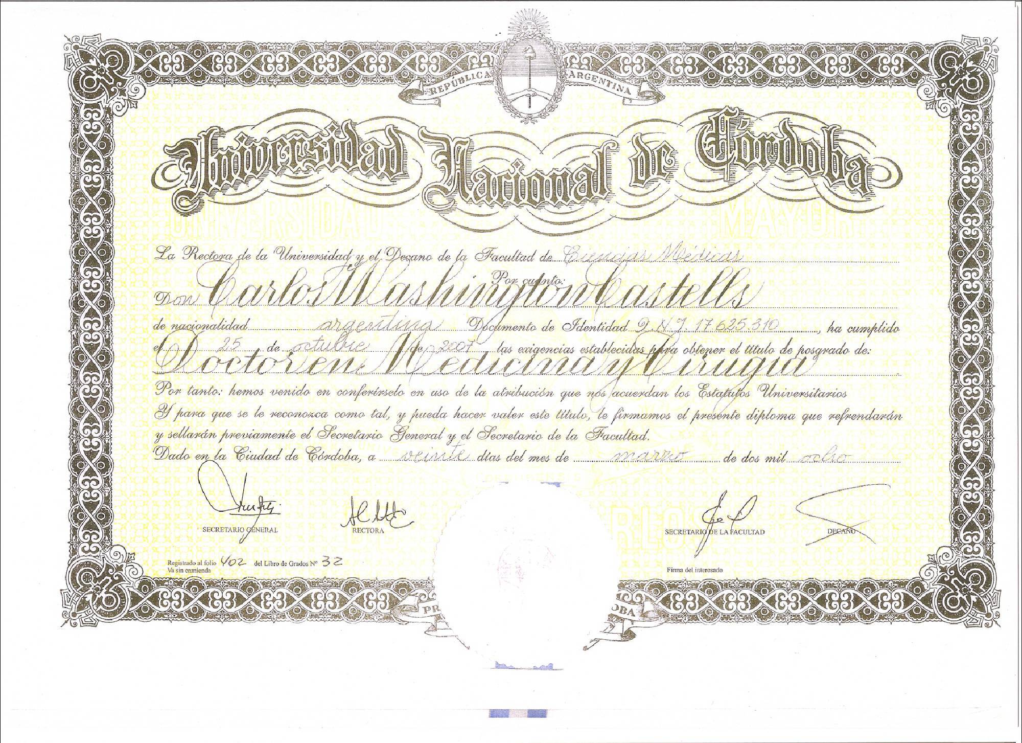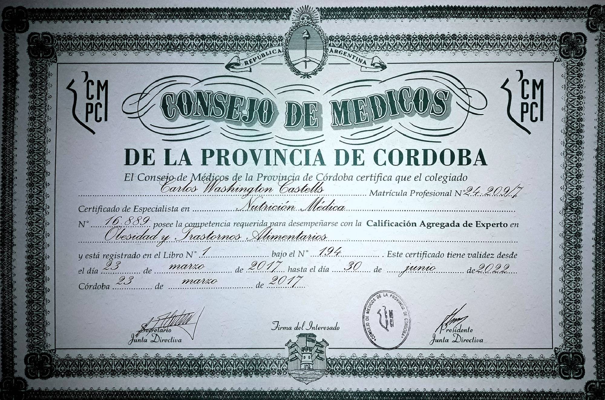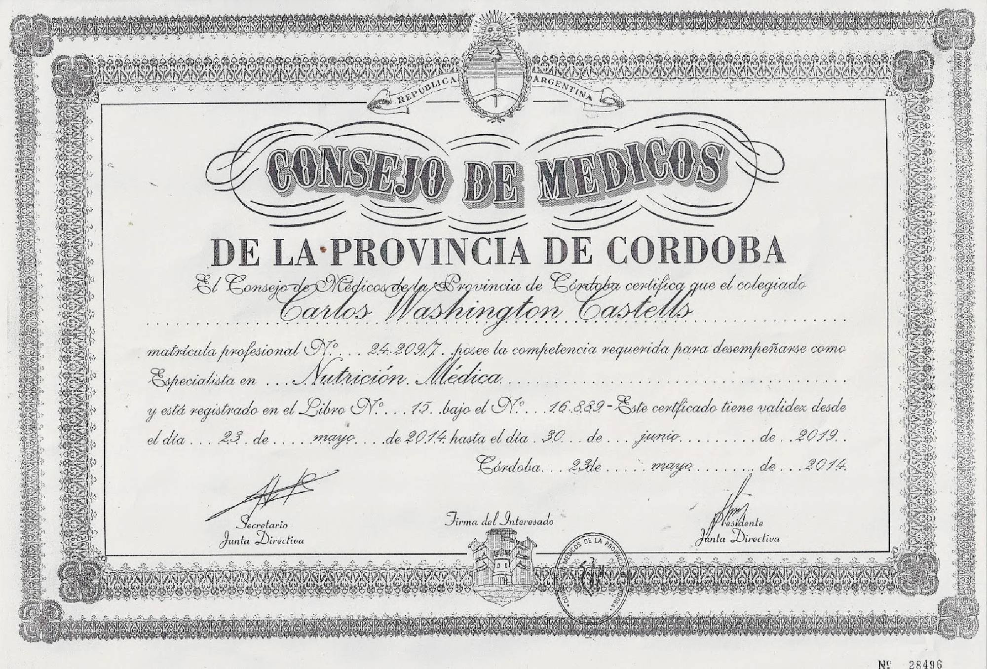 Prof. Dr. Carlos Washington Castells , MD, PhD Medico Cirujano - MP 93690 Doctor en Medicina y Cirugía Especialista en Nutrición Médica ME:16889